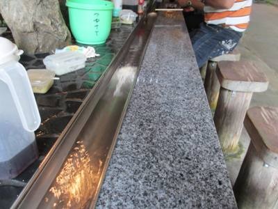 ソーメン流しの会場につくと、そこには滝があり冷房並みの涼しさでした。いざソーメン流しがスタートするとなかなかソーメンをとる事が出来ず